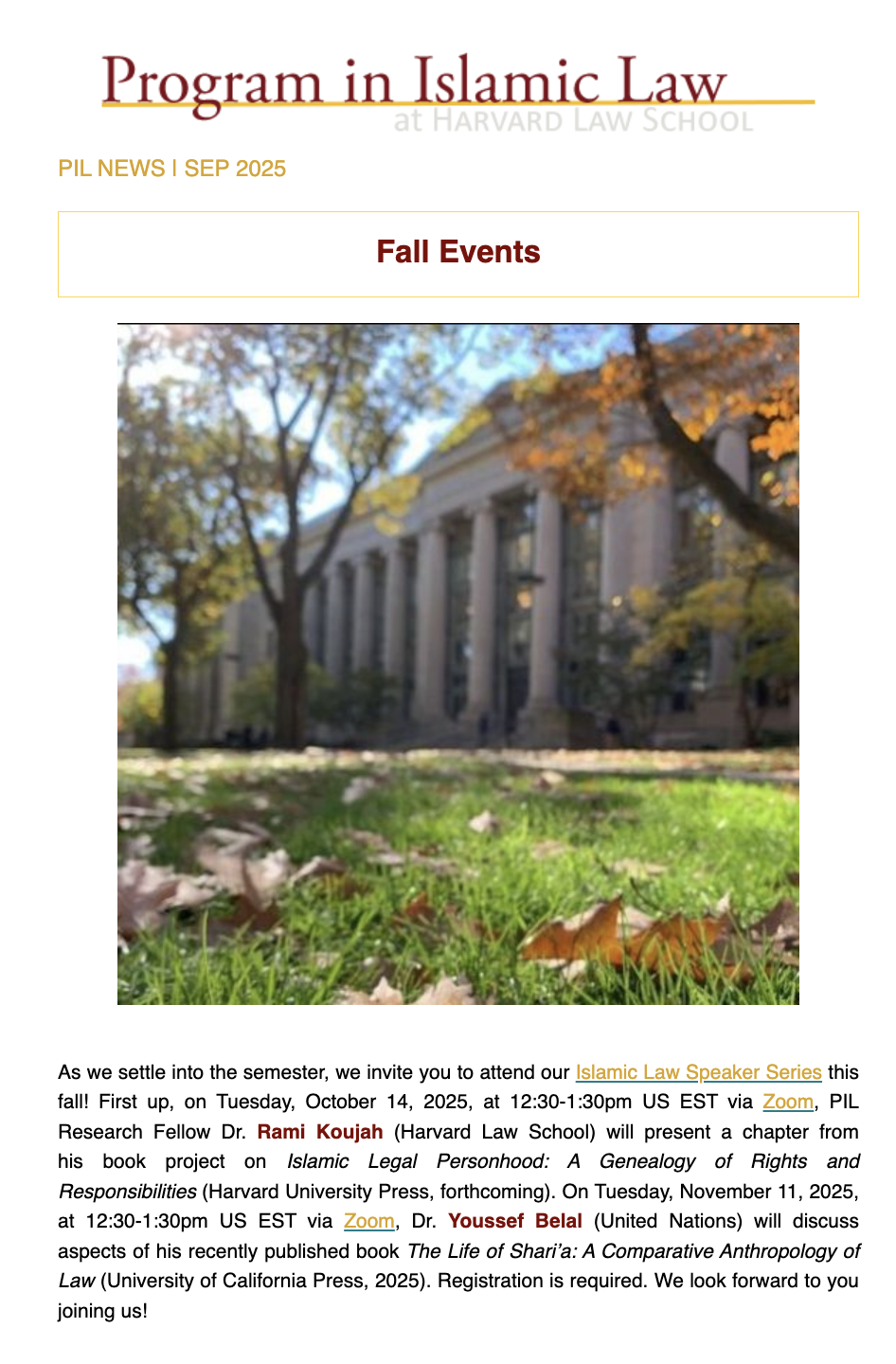 Fall Events As we settle into the semester, we invite you to attend our Islamic Law Speaker Series this fall! First up, on Tuesday, October 14, 2025, at 12:30-1:30pm US EST via Zoom, PIL Research Fellow Dr. Rami Koujah (Harvard Law School) will present a chapter from his book project on Islamic Legal Personhood: A Genealogy of Rights and Responsibilities (Harvard University Press, forthcoming). On Tuesday, November 11, 2025, at 12:30-1:30pm US EST via Zoom, Dr. Youssef Belal (United Nations) will discuss aspects of his recently published book The Life of Shari’a: A Comparative Anthropology of Law (University of California Press, 2025). Registration is required. We look forward to you joining us!