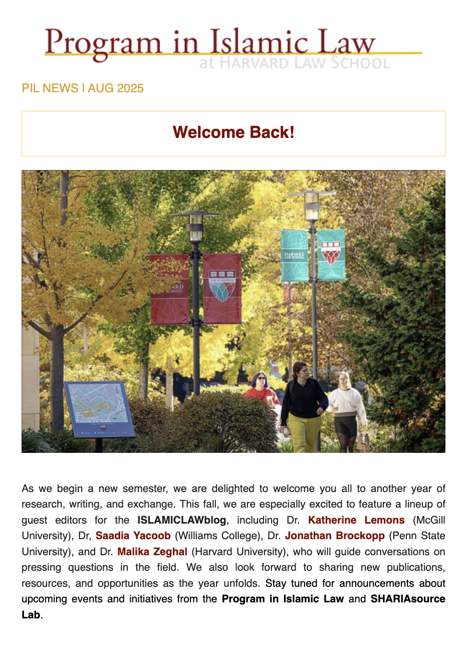 Welcome Back! As we begin a new semester, we are delighted to welcome you all to another year of research, writing, and exchange. This fall, we are especially excited to feature a lineup of guest editors for the ISLAMICLAWblog, including Dr. Katherine Lemons (McGill University), Dr, Saadia Yacoob (Williams College), Dr. Jonathan Brockopp (Penn State University), and Dr. Malika Zeghal (Harvard University), who will guide conversations on pressing questions in the field. We also look forward to sharing new publications, resources, and opportunities as the year unfolds. Stay tuned for announcements about upcoming events and initiatives from the Program in Islamic Law and SHARIAsource Lab.